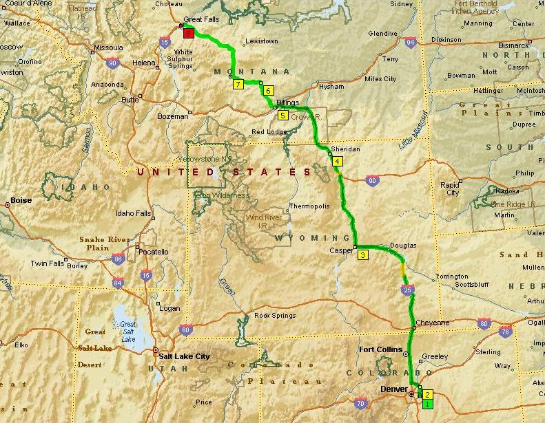 I departed Aurora at around 8:00am Friday morning June 1. The day was mostly interstate until Billings, MT. I was anxious to get into Canada and really didn't want to do much sightseeing in Colorado and Wyoming. I stopped for lunch with a friend from bmwlt.com in Casper, WY. From Casper I continued on to Billings, MT on I-25/I-80. I traveled north on Montana 3/US12/US191/US87 to Great Falls, MT where I stopped for the night. There wasn't much that grabbed me for pictures in this stretch. It is nice enough scenery, but way too familiar.
